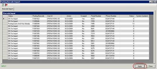 The Posting Barcode Import screen will open displaying all the completed jobs that are ready for import. Click Apply to begin the import process.